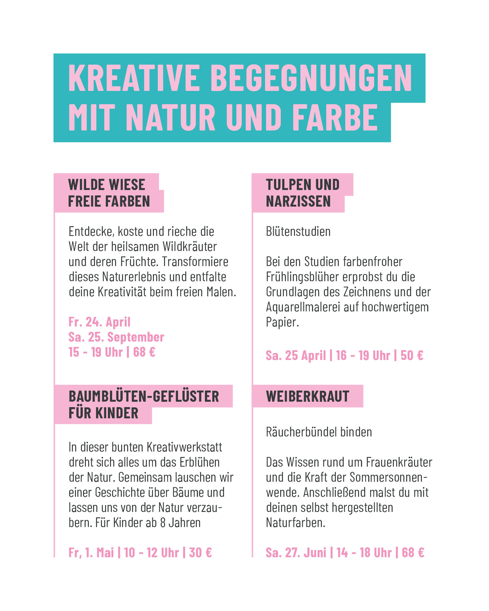 Entdecke, koste und rieche die Welt der heilsamen Wildkräuter und deren Früchte. Transformiere dieses Naturerlebnis und entfalte deine Kreativität beim freien Malen.